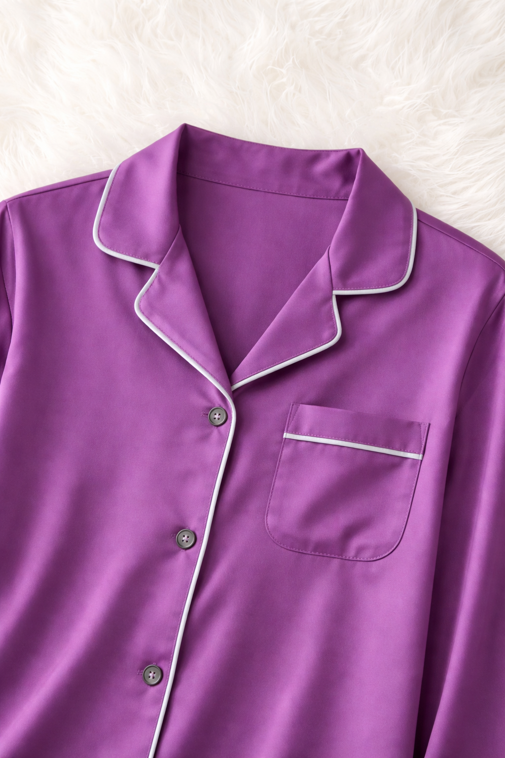Elevated comfort meets understated luxury. Crafted in a smooth cotton-silk blend, this rich amethyst lounge shirt is designed with a fluid drape and a soft sheen that feels as indulgent as it looks. The tailored button-down silhouette is refined with delicate grey piping along the notched collar and pocket, adding a subtle contrast that enhances its timeless appeal. Lightweight, breathable, and effortlessly elegant—perfect for slow mornings, quiet evenings, and everything in between.