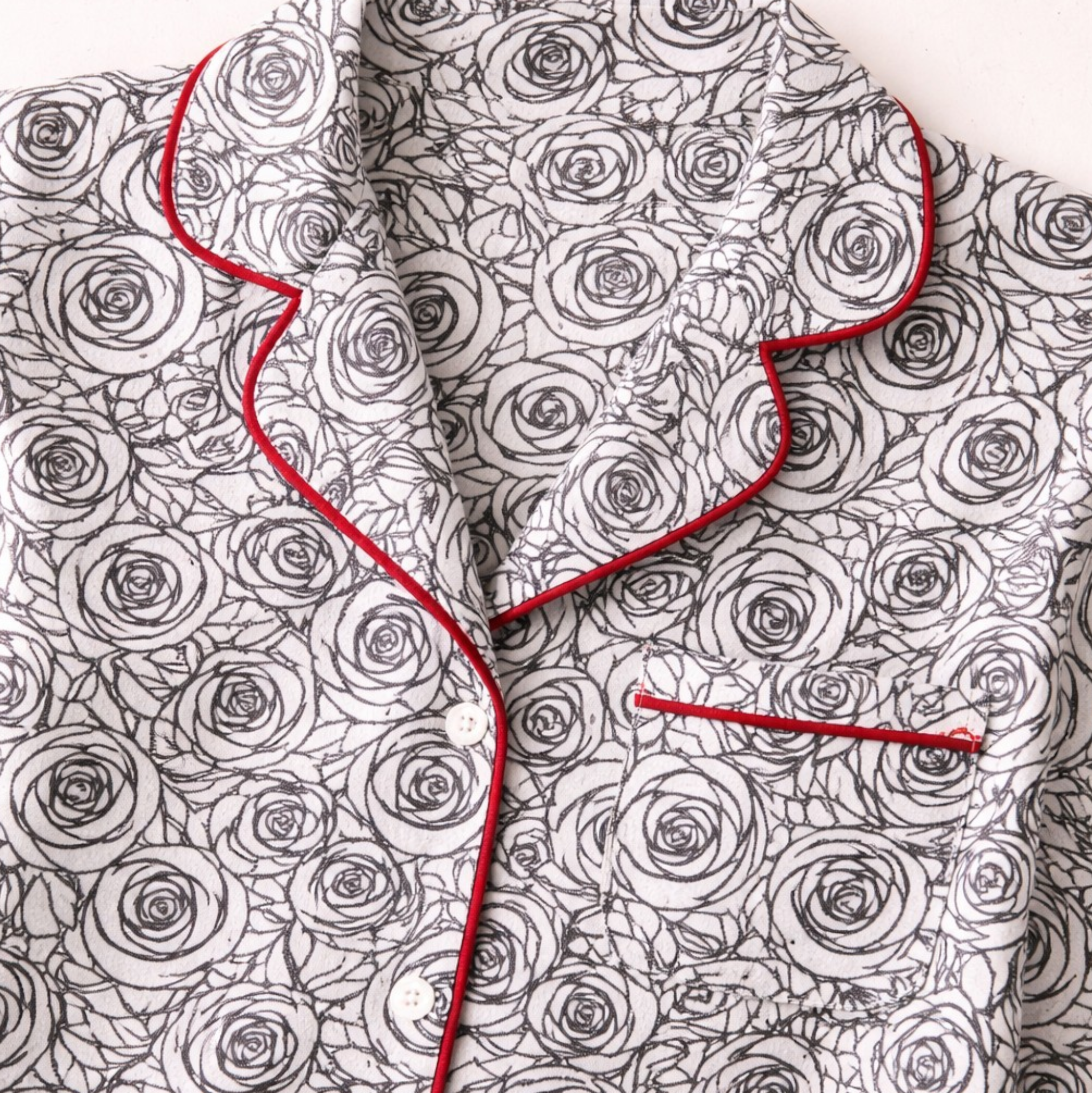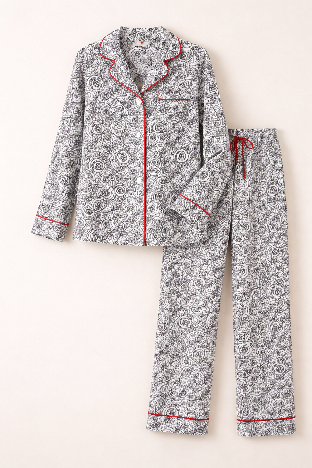 This balck and white loungewear is meant to elevate everyday lounging, featuring a relaxed button down shirt and full length trousers.